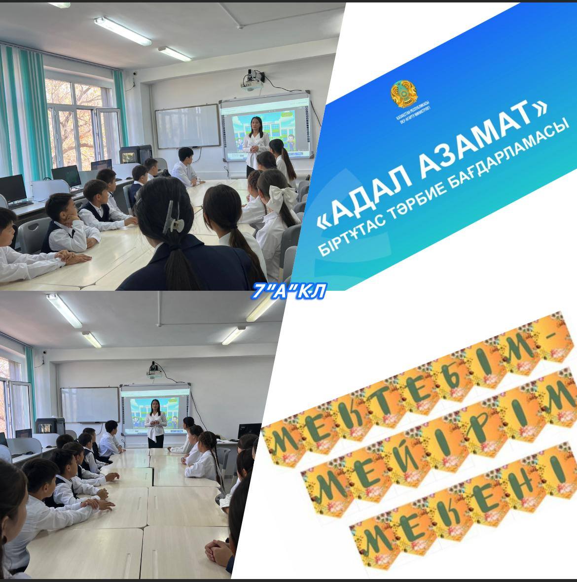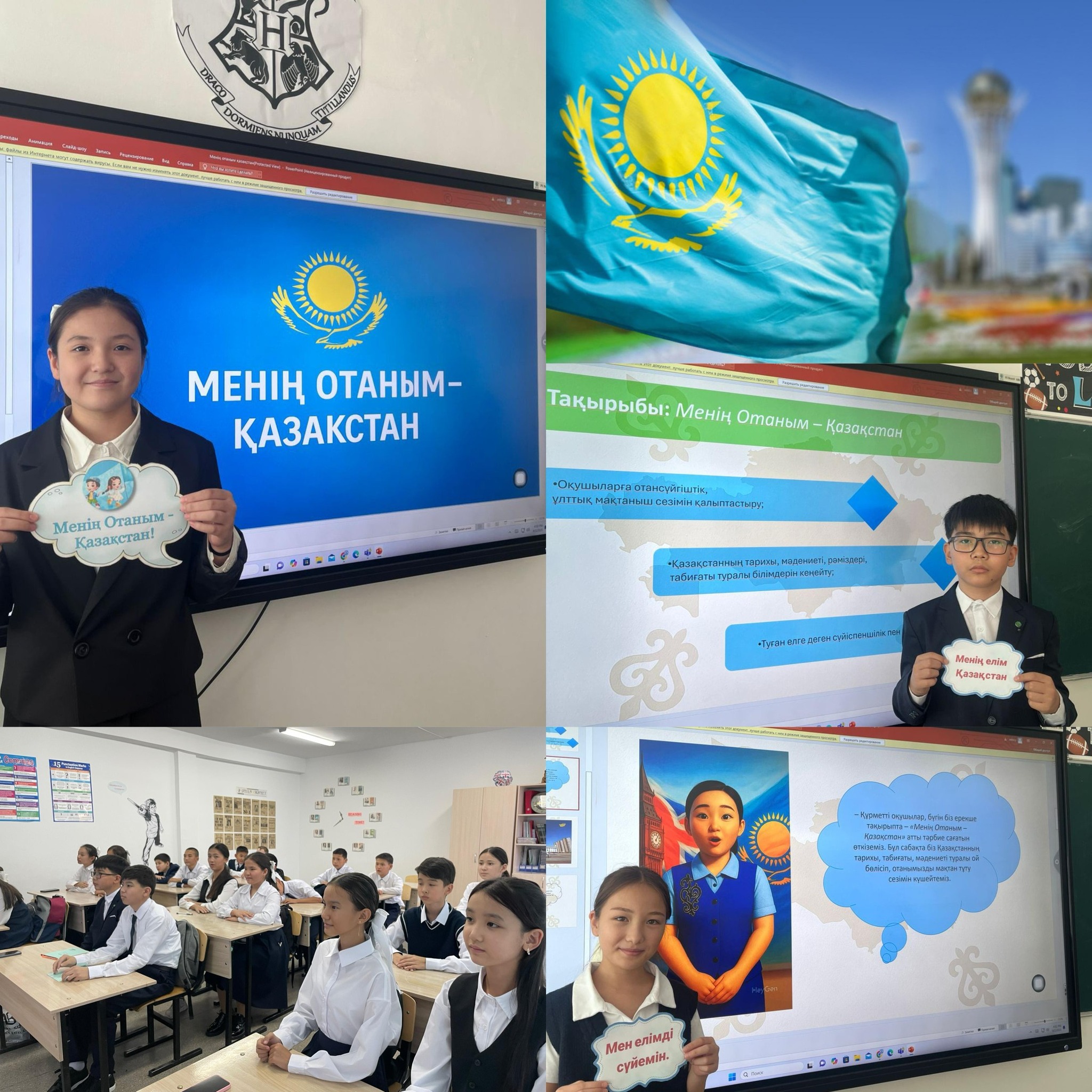 "Адал азамат" Біртұтас тәрбие бағдарламасының жоспарына сәйкес 2.09.2025 күні 1-11 сыныптар арасында "Менің отаным Қазақстан" тақырыбында бірыңғай сынып сағаттары өтті.