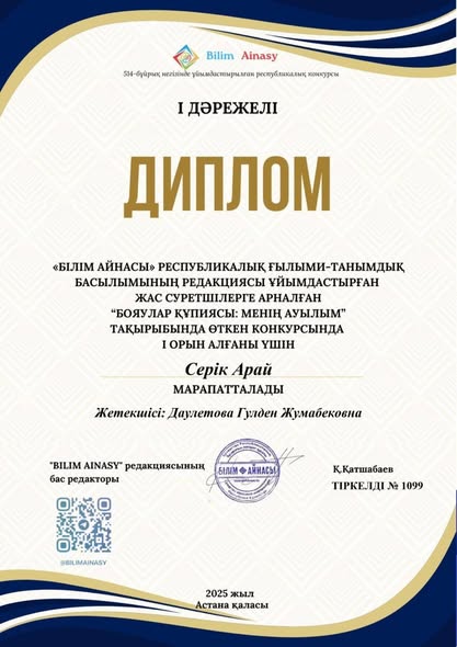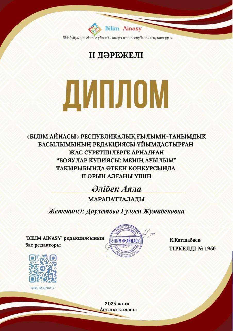 "Білім айнасы" Республикалық ғылыми- танымдық басылымның редакциясы ұйымдастырған жас суретшілерге арналған "Бояулар құпиясы: менің ауылым" тақырыбында өткен конкурсқа жеңімпаз атанған: