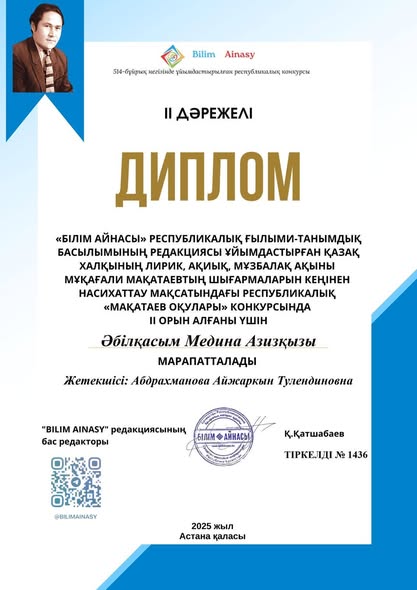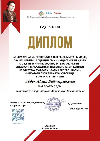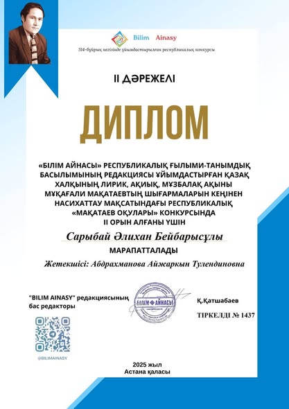"Білім айнасы" Республикалық ғылыми- танымдық басылымның редакциясы ұйымдастырған қазақ халқының лирик, ақиық,мұзбалақ ақыны Мұқағали Мұқатаевтың шығармаларын кеңінен насихаттау мақсатындағы Республикалық " Мақатаевтар оқулары" конкурсына мектепалды даярлық сынып оқушылары қатысып жүлделі орындарға ие болды: