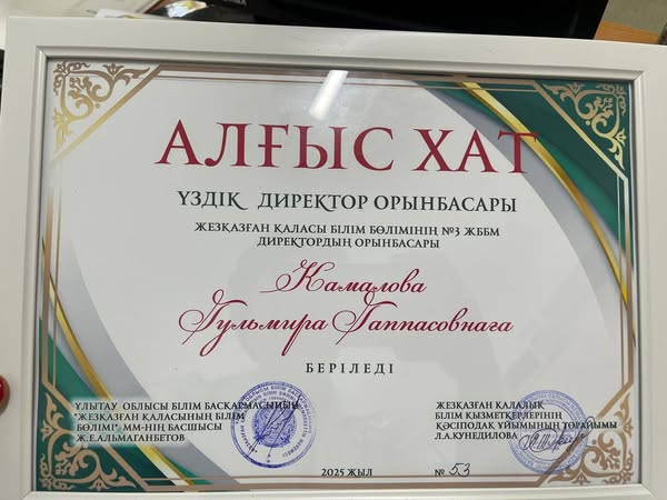 "Үздік директор орынбасары" номинациясымен Камалова Гульмира Гаппасовна Алғыс хатпен марапатталды.