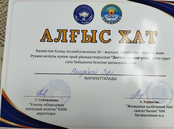 Қазақстан Халқы Ассамблеясының 30-эылдық мерейтойы аясында және Рухани келісім күніне орай ұйымдастырылған "Достық қолын ұсын" атты сурет салу байқауына белсене қатысқан үшін Молдабай Зере Алғыс хатпен марапатталды.
