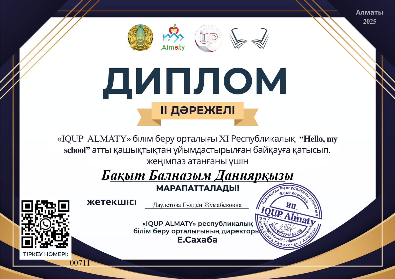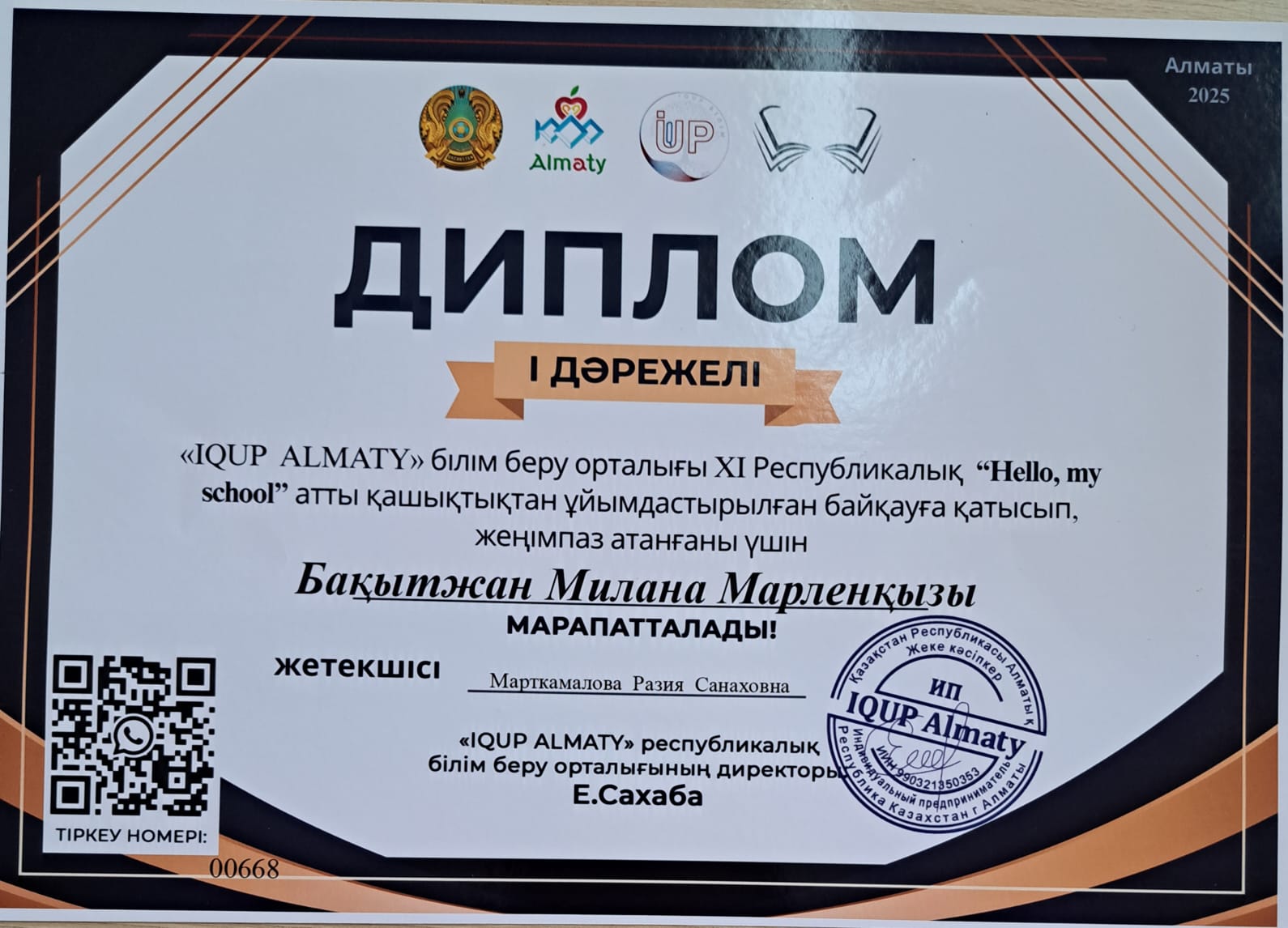 "IQUP ALMATY"білім беру орталығы ХІ Республикалық "Hello, my school"атты қашықтықтан ұйымдастырылған байқауға қатысып жүлделі орынға ие болды: