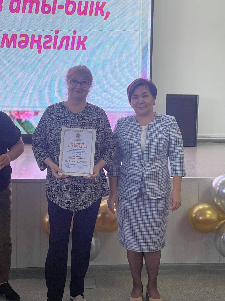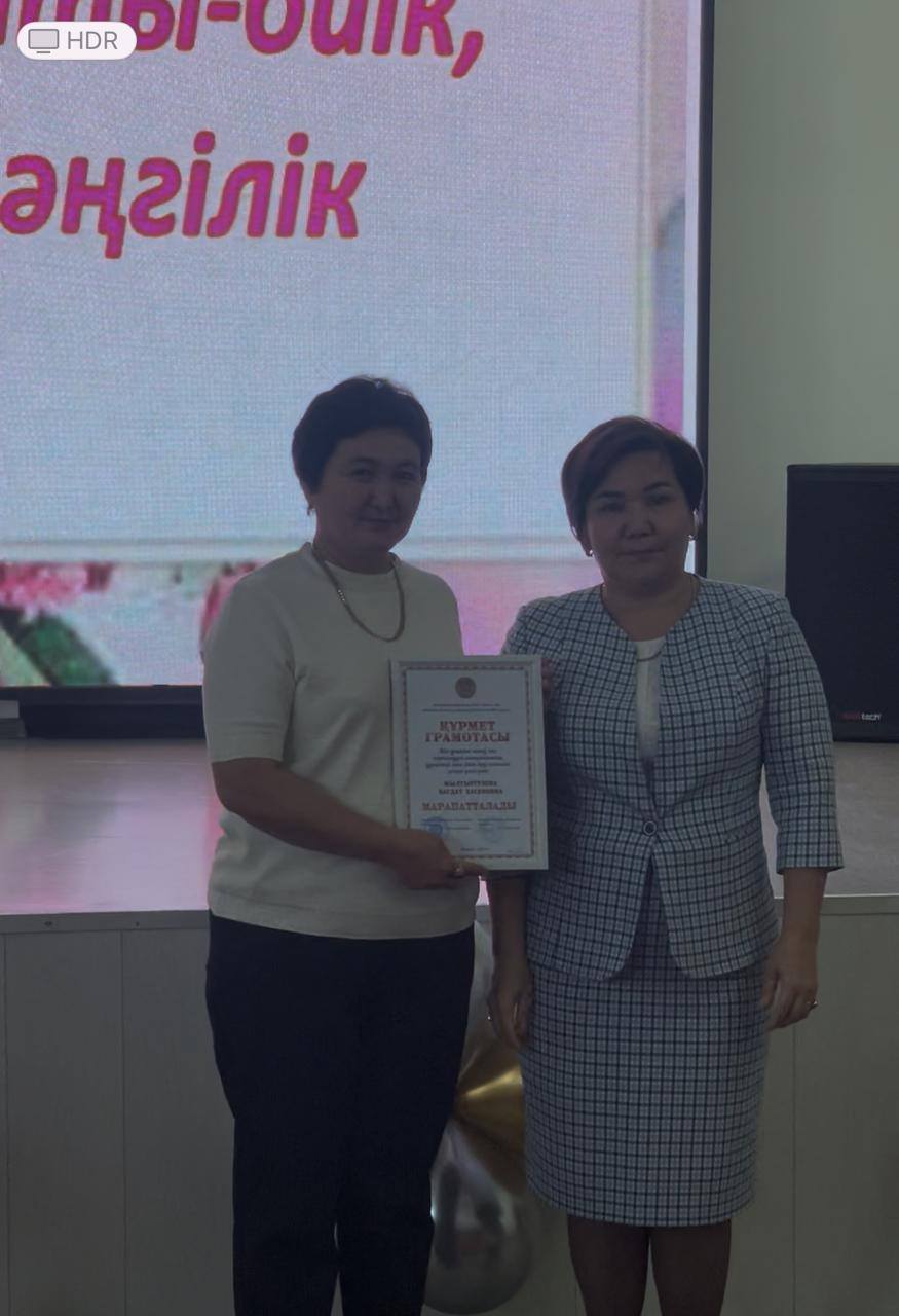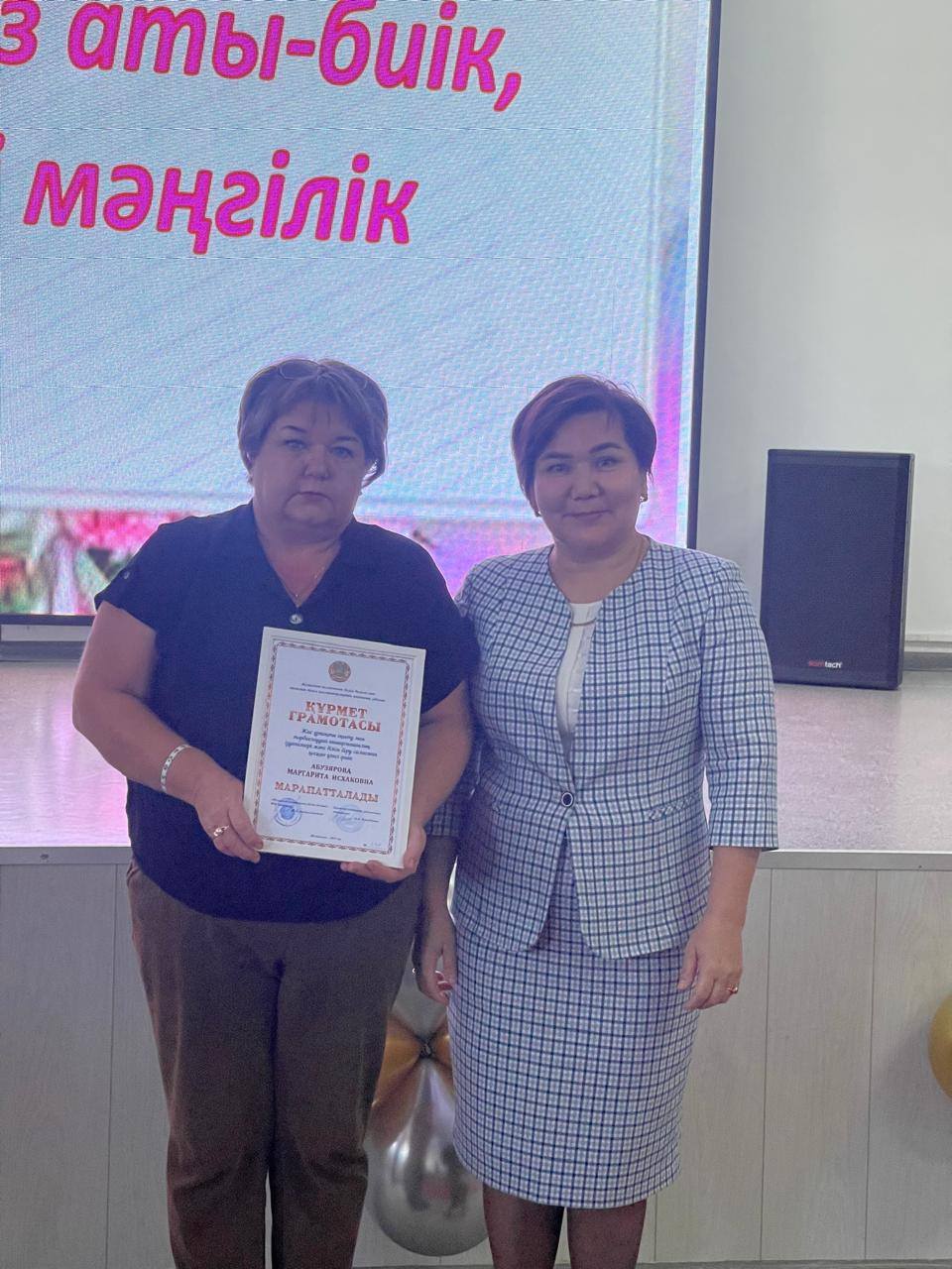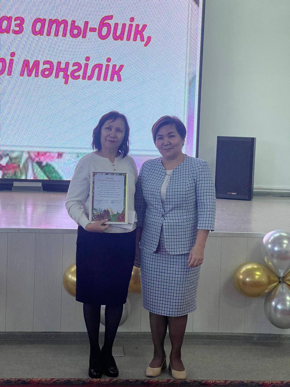 Мектеп директоры А.Т. Мукашева бірқатар ұстаздарды өскелең ұрпаққа білім берудегі және тәрбиелеудегі жетістіктері үшін, берекелі елдігіміз бен бірлігіміздің нығаюына және өскелең ұрпаққа білім мен тәрбие берудегі қосқан еңбегі үшін Құрмет грамотасымен , алғыс хаттармен марапаттады. Оқушылар және жас мамандар ән шырқап, ұстаздарға көтеріңкі көңіл-күй сыйлады.