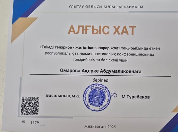 "Тиімді тәжірибе -жетістікке апарар жол" тақырыбында өткен республикалық ғылыми-практикалық конференциясында тәжірибесімен бөліскен математика пәнінің мұғалімі Омарова Ақерке Абдумаликовна Алғыс хатпен марапатталды.
