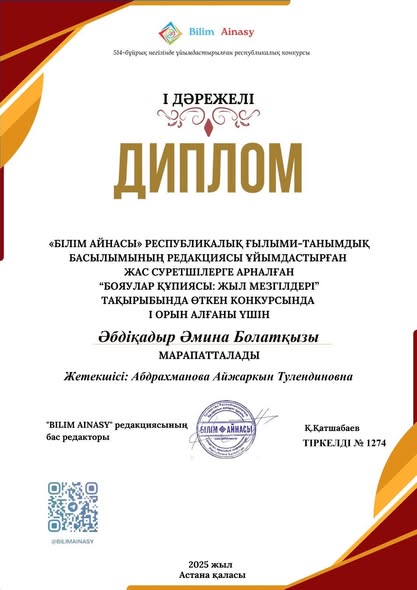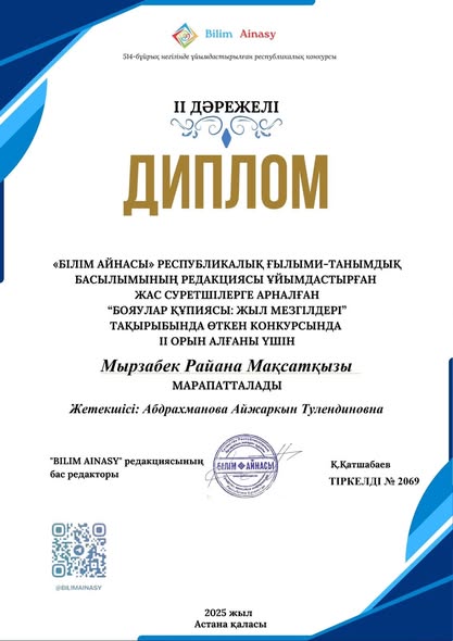 "Білім айнасы" Республикалық ғылыми- танымдық басылымның редакциясы ұйымдастырған жас суретшілерге арналған “Бояулар құпиясы: жыл мезгілдері” тақырыбында өткен конкурсқа мектепалды даярлые сынып оқушылары қатысып жүлделі орындарға ие болды: