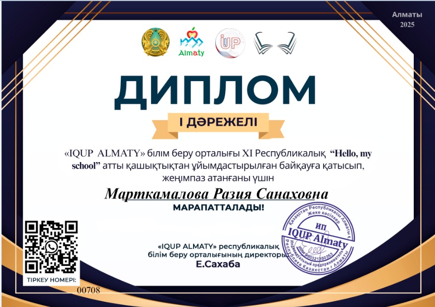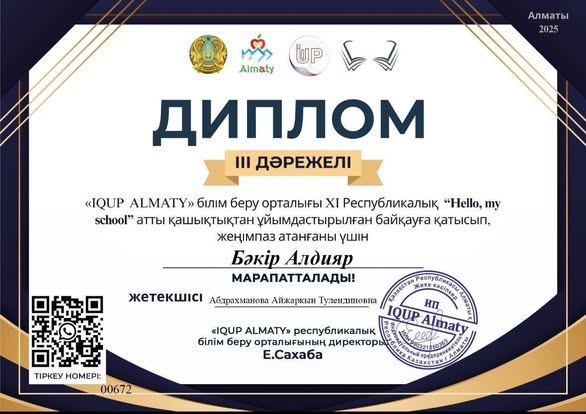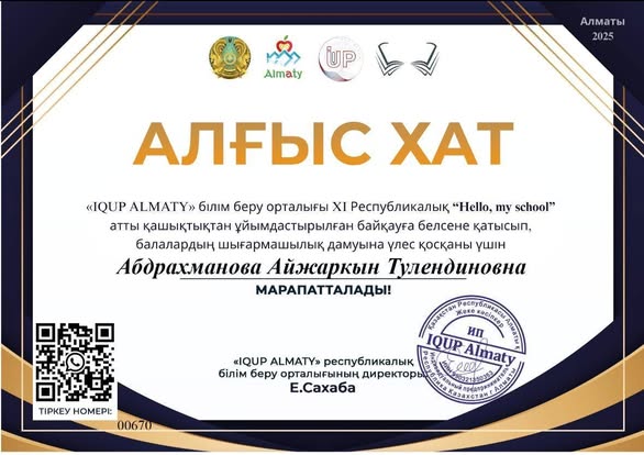"IQUP ALMATY"білім беру орталығы ХІ Республикалық "Hello, my school"атты қашықтықтан ұйымдастырылған байқауға қатысып жүлделі орынға ие болды: